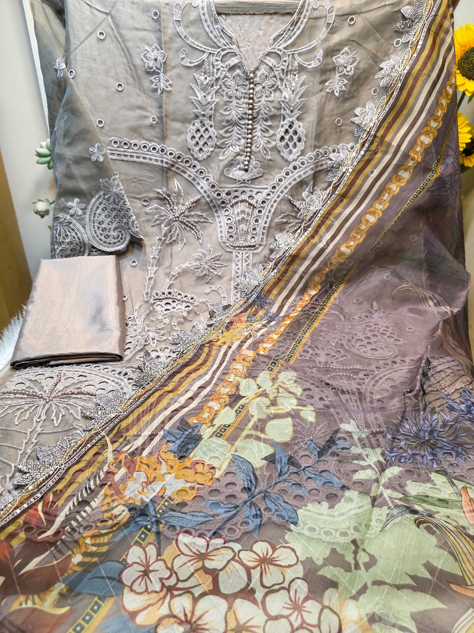 ★ Orna: Indian Sada Bahar with digital print & Chikenkari embroidery work.